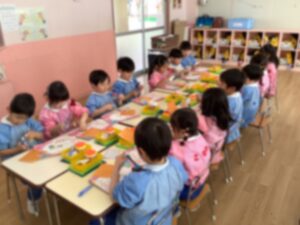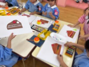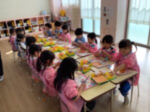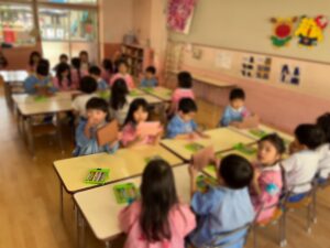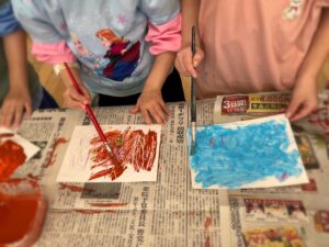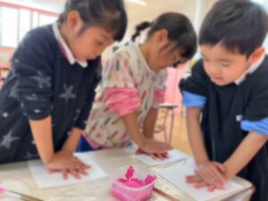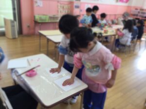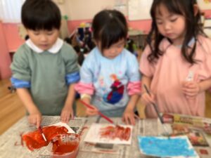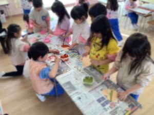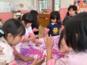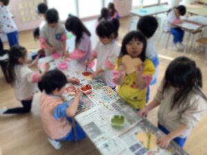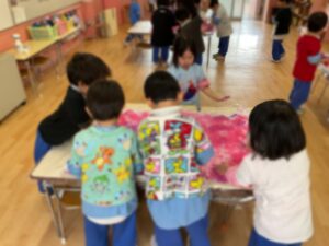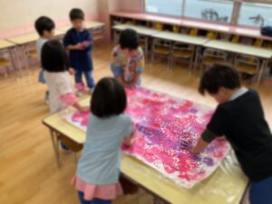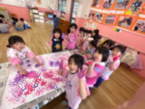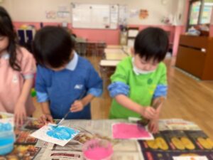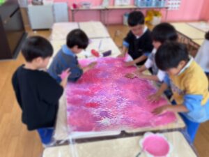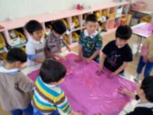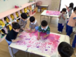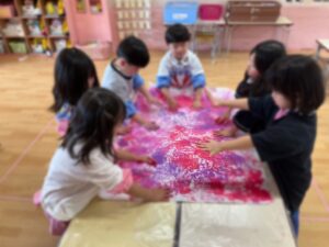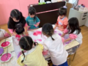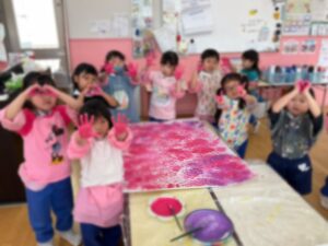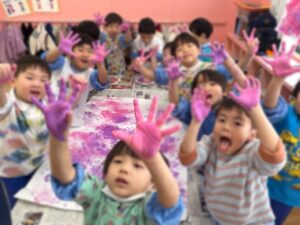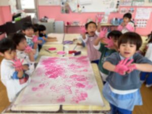 手に絵の具🎨を塗りペタペタ!桜のお花でいっぱいになりました。