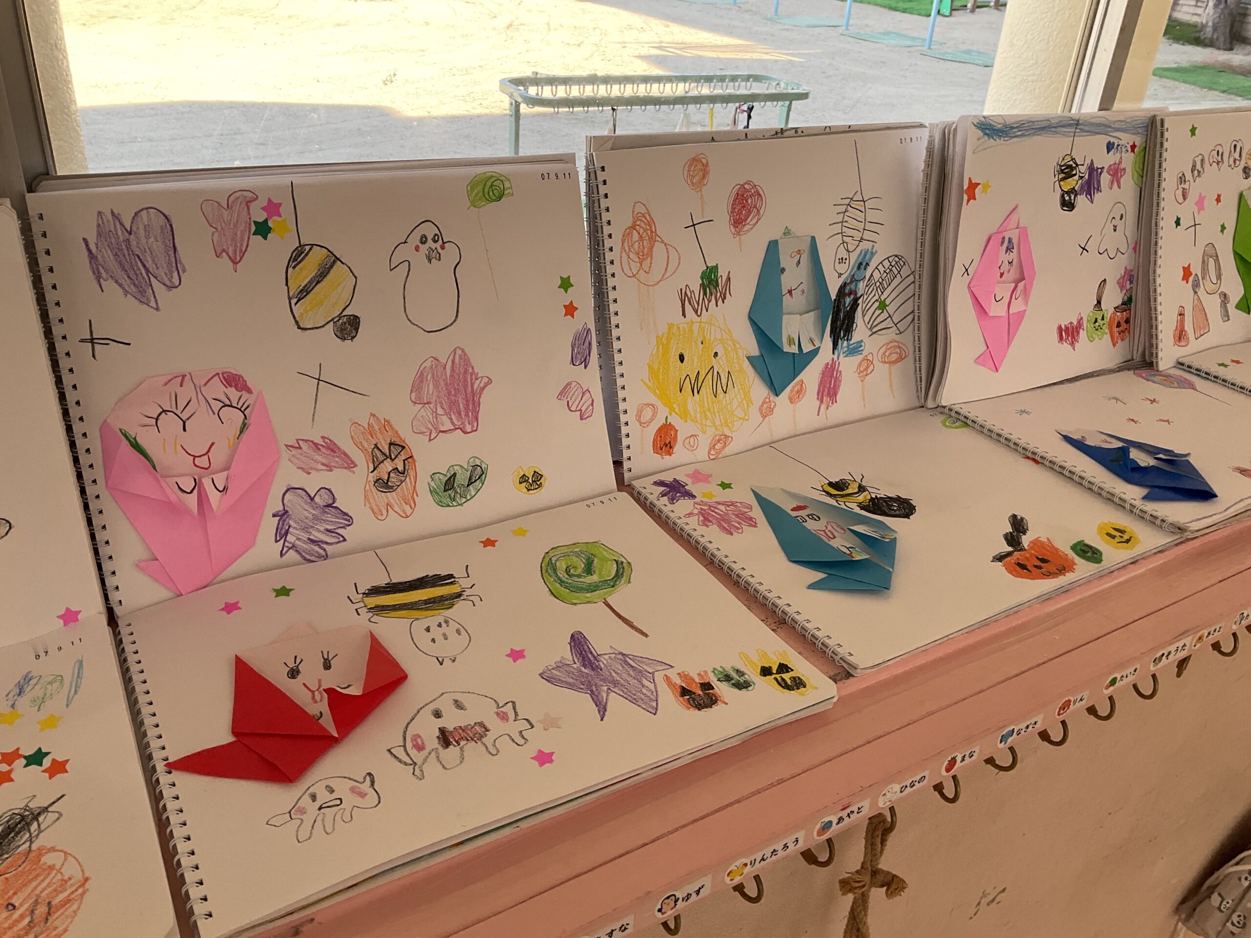 先月に折ってお部屋に飾っていたおばけを自由画帳に貼り、