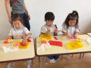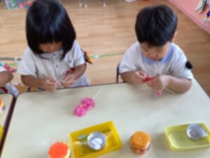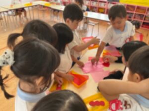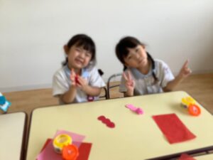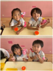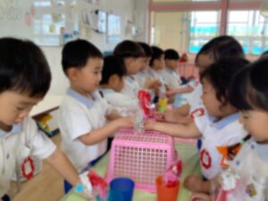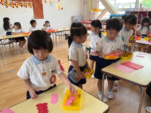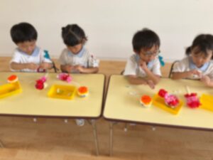 お花紙を丸めていちごを作り、シールでトッピングもして、とても美味しそうな、