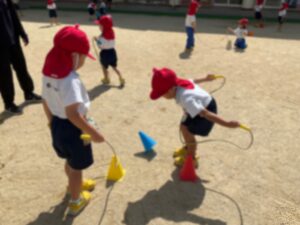 縄跳びを蛇の様に動かしたり、コーンを引っ掛けたりと、