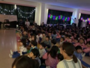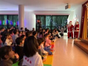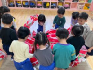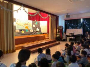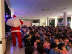 先生からの出し物でサンタさんのお話を聞き、