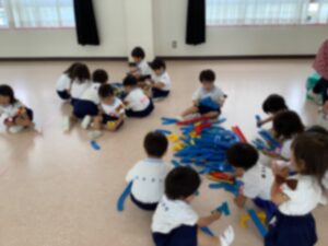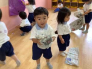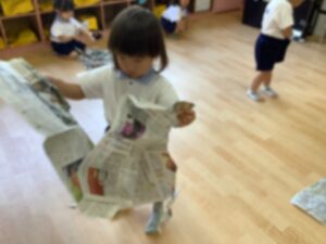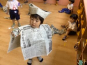 新聞紙をビリビリにちぎったり、服を作ったり、お布団にしているお友達もいました😁